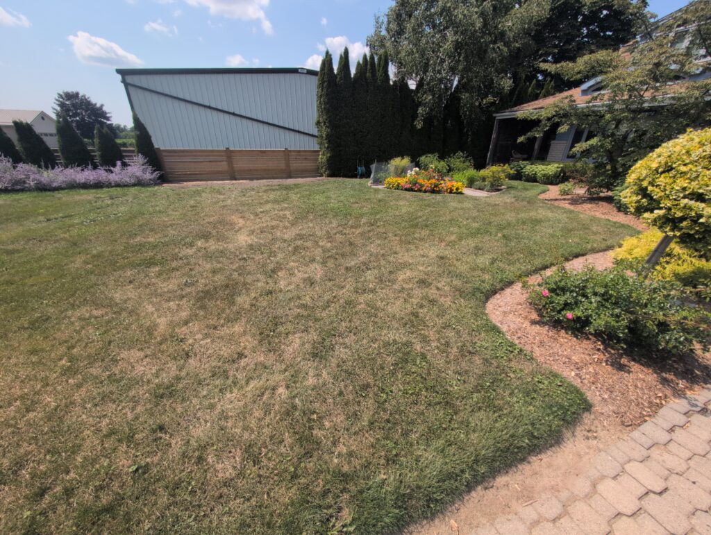 • August 12: Heat stress in spots (relentless dry summer) needs water—mow 3+ inches, even on edges.